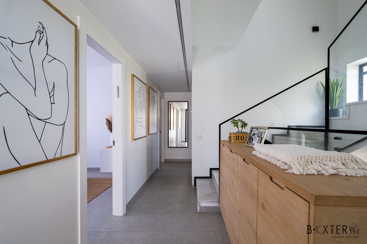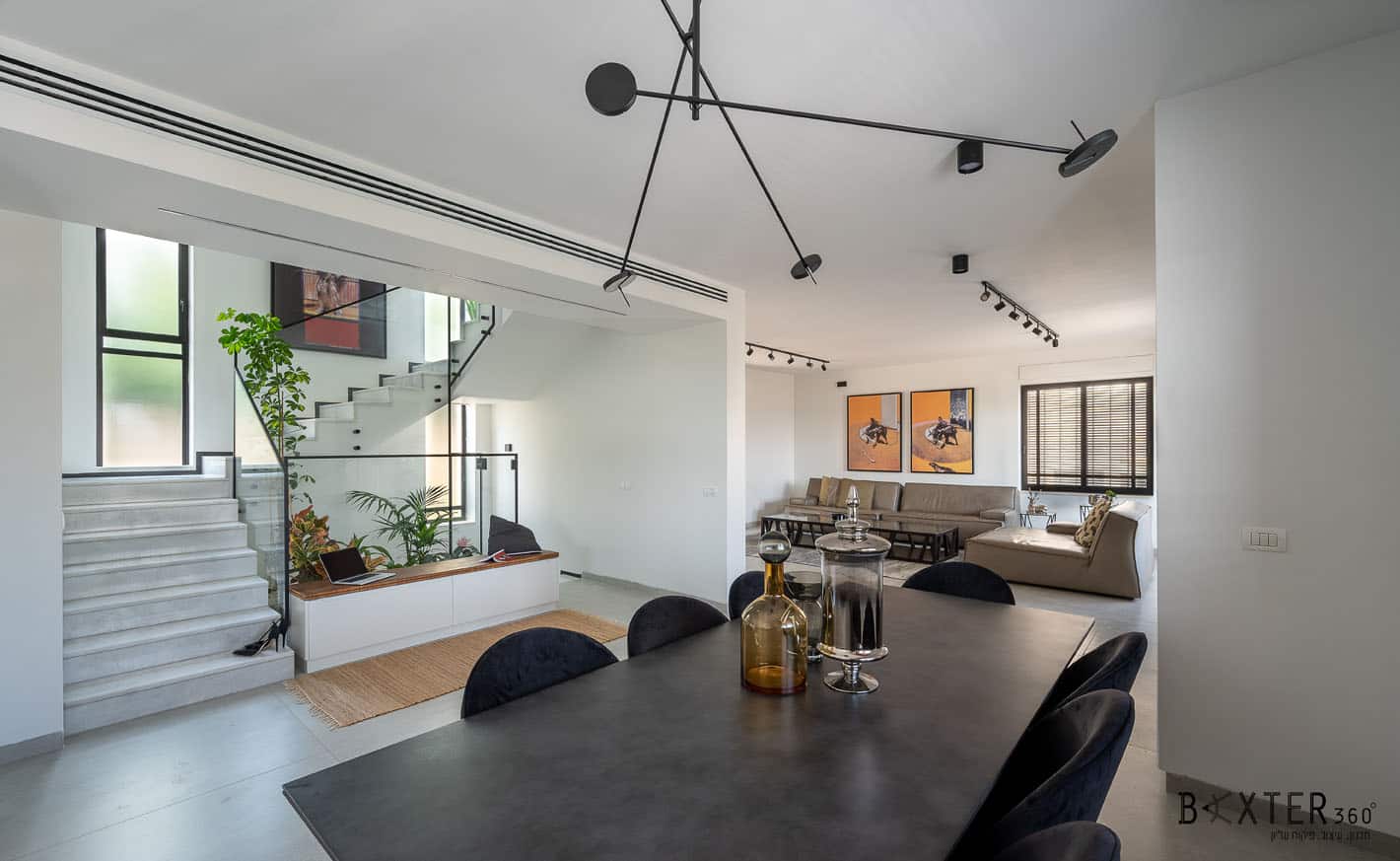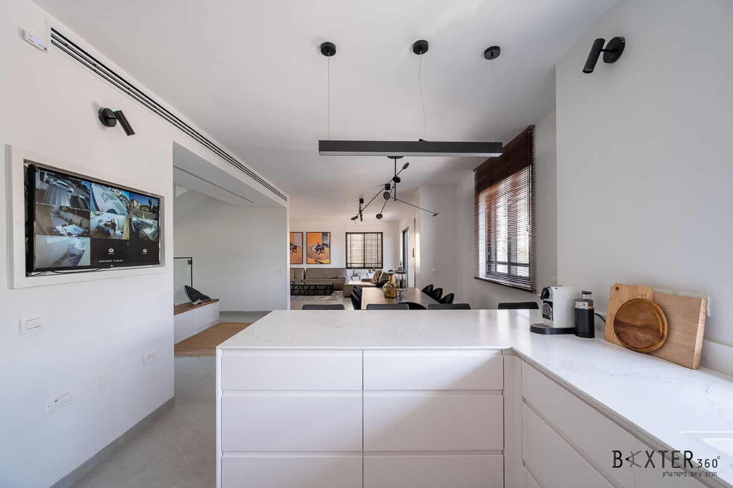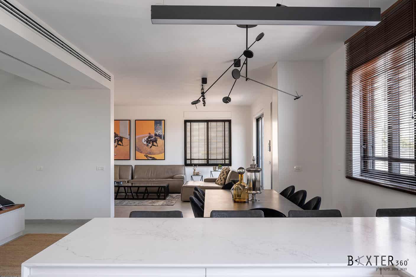 בקשת בעלי הדירה הייתה לייצר בית, מרווח, פרקטי עם קווים נקיים, מודרנים וסימטריים אך בכל זאת חשוב שתתקבל תחושה של בית חם ומזמין. השילוב של צרכים, פרופורציות השטח והטעם האישי של המשפחה השתלבו יחד והולידו בית בעל מראה מודרני-חם ונוח העונה על אופי וסגנון חיי המשפחה.חצי מדו משפחתי ומרווח שתוכנן עם הקפדה למתן תחושת בית פרטי ועם הלימה לכל התהליך משלב ראשוני בסיסי ועד לסיום הבניה. המאפיין העיקרי בפרויקט הוא חיבור השטחים הרחבים וההוריזונטליים עם קו ורטיקלי צירי מנחה וברור בלב הבית.