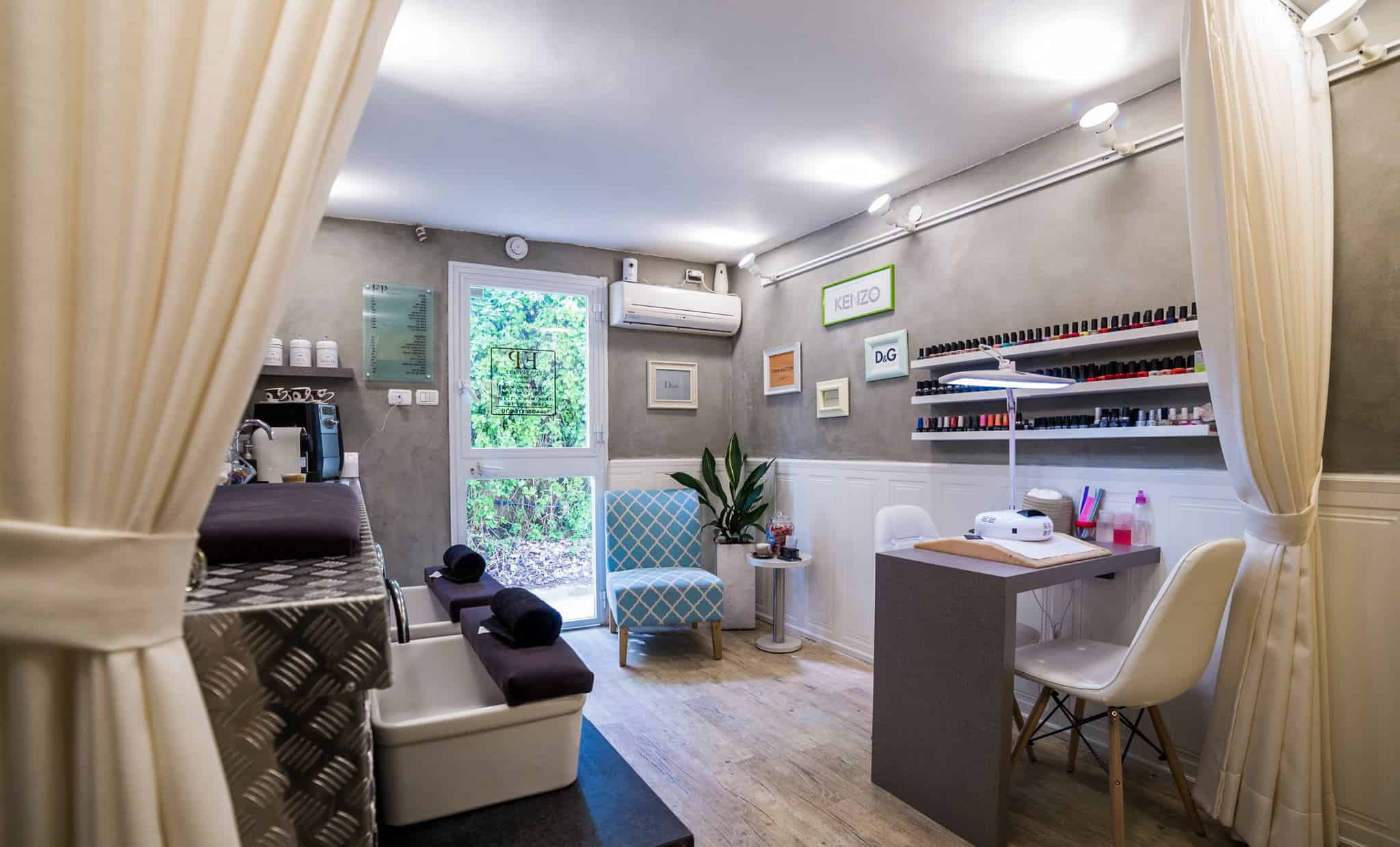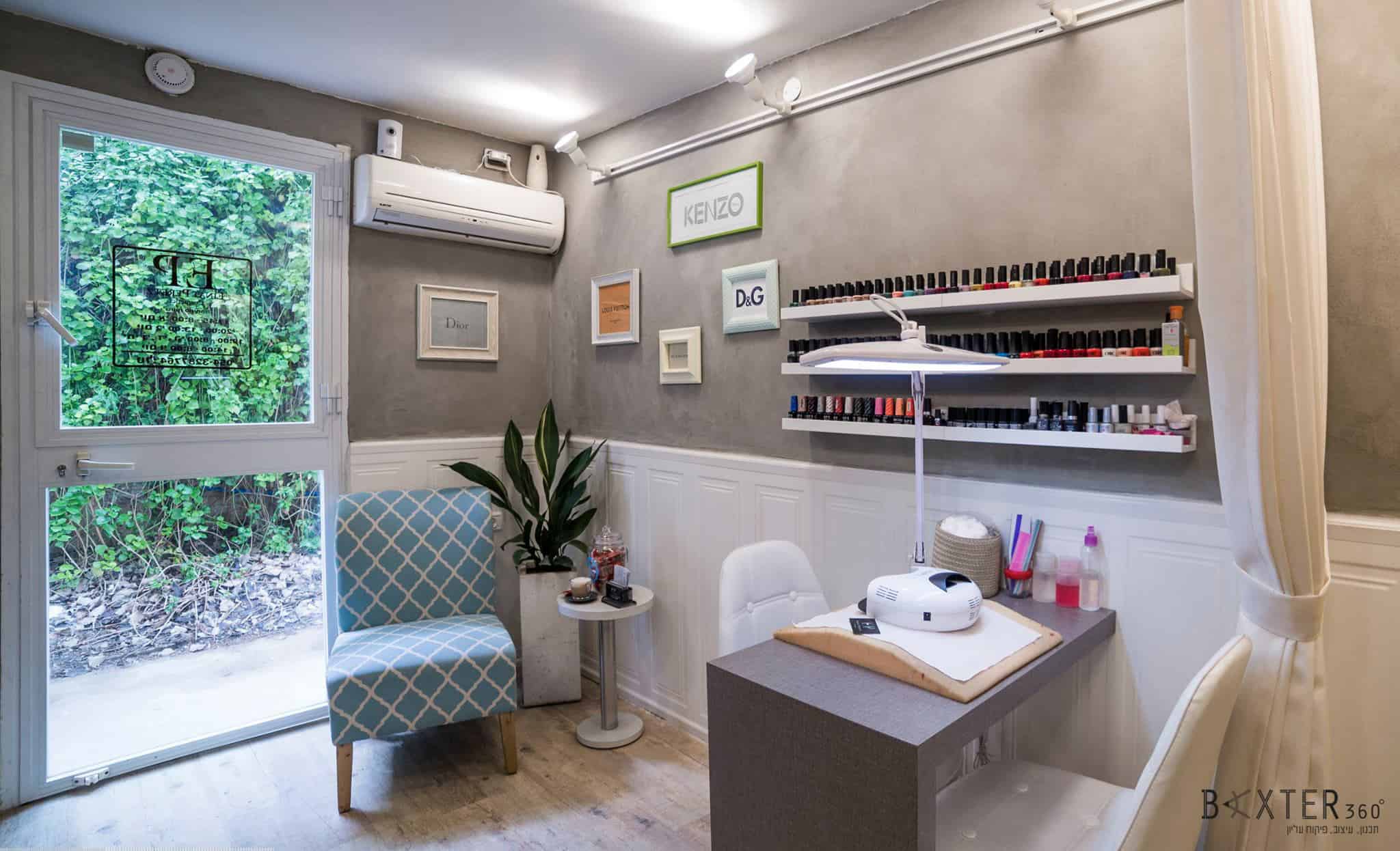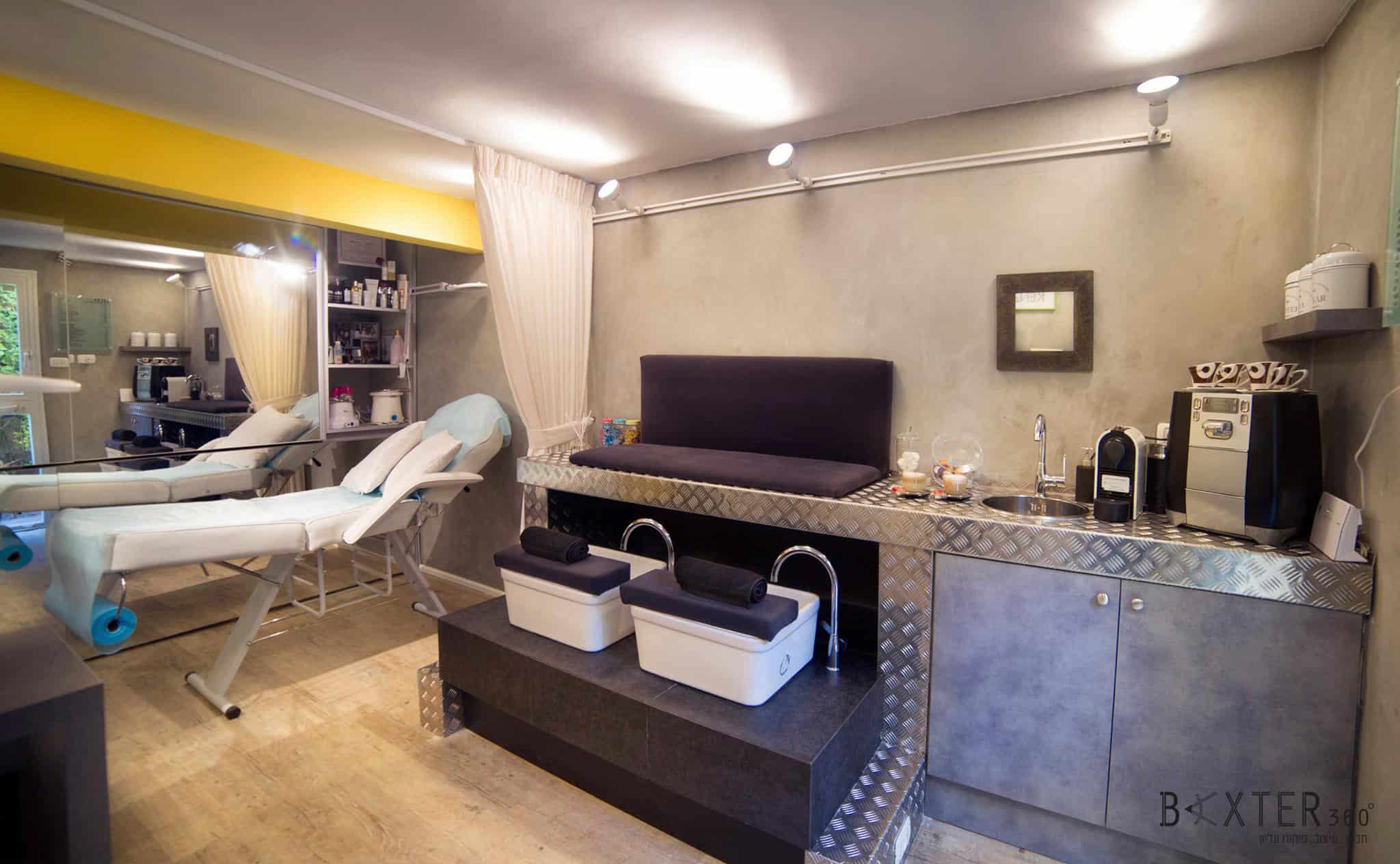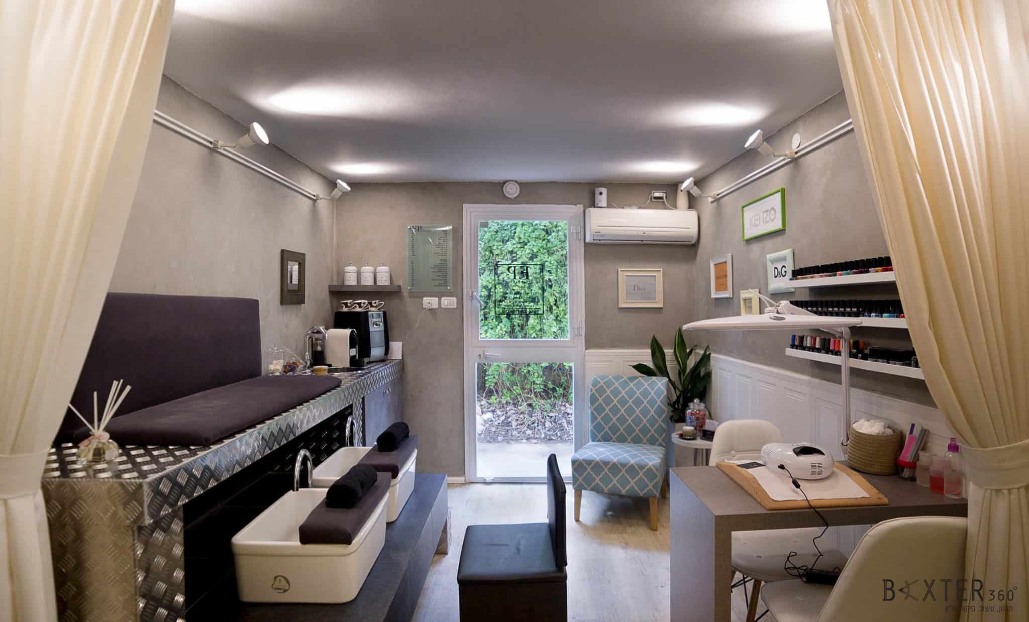 חדר קטן וחשוך שקיבל חיים חדשים בעזרת תכנון טוב ושילובים של חומרים מעניינים ובלתי שגרתיים. בתכנון יצירתי ומוקפד הפקנו את המיטב מהמקום. מהחסרונות יצרנו יתרונות. קיימות בו היום 5 פונקציות פעילות: פינת המתנה, פינת קפה, במה מוגבהת עם 2 מקומות לפדיקור רטוב, מיטת טיפולים, שולחן מניקור.